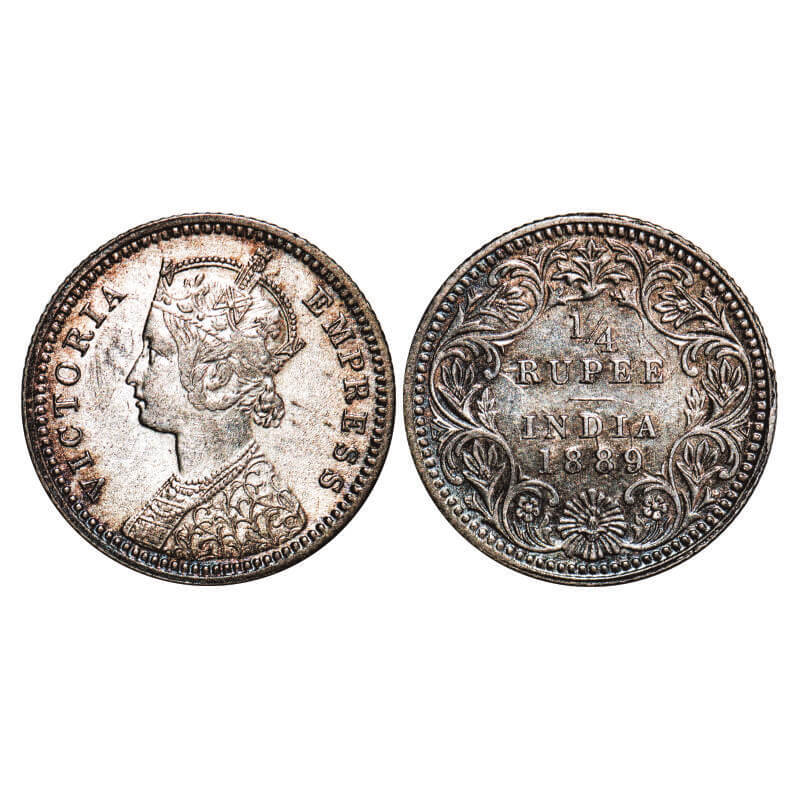 | Victoria Empress, Silver, 1/4 Rupee, 1889, Calcutta Mint, C/II, ‘C’ incused, Ghost on Rev. F. Prid 394. GK 716. About Uncirculated, Toned. Very Scarce. |