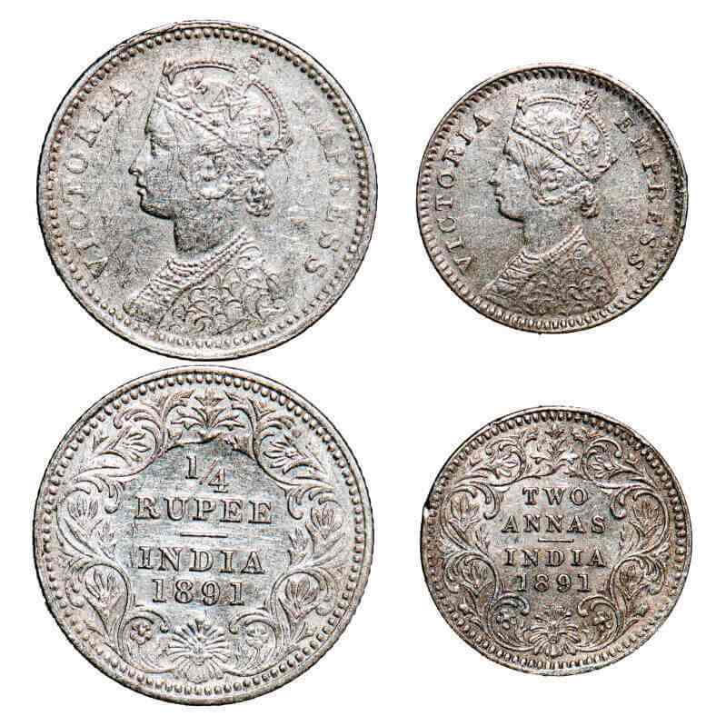 | Victoria Empress, Silver, (2 coins), 1891, Calcutta Mint, 1) 1/4 Rupee, C/II, ‘C’ incused, 2) 2 Annas, B/II, ‘C’ incused. F. Prid 396, 506. GK 721, 795. Extremely Fine to About Uncirculated. Very Scarce. |