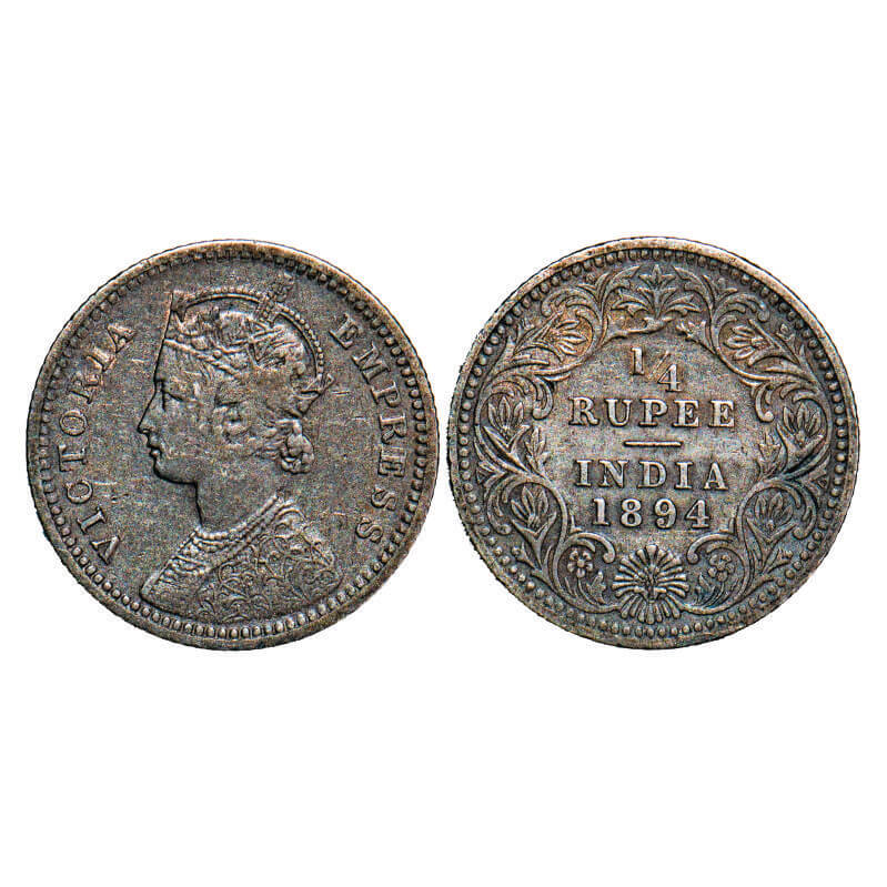Victoria Empress, Silver, 1/4 Rupee, 1894, Calcutta Mint, C/II, ‘C’ incused. F. Prid 399. GK 727. Very Fine, Cleaned. Scarce.