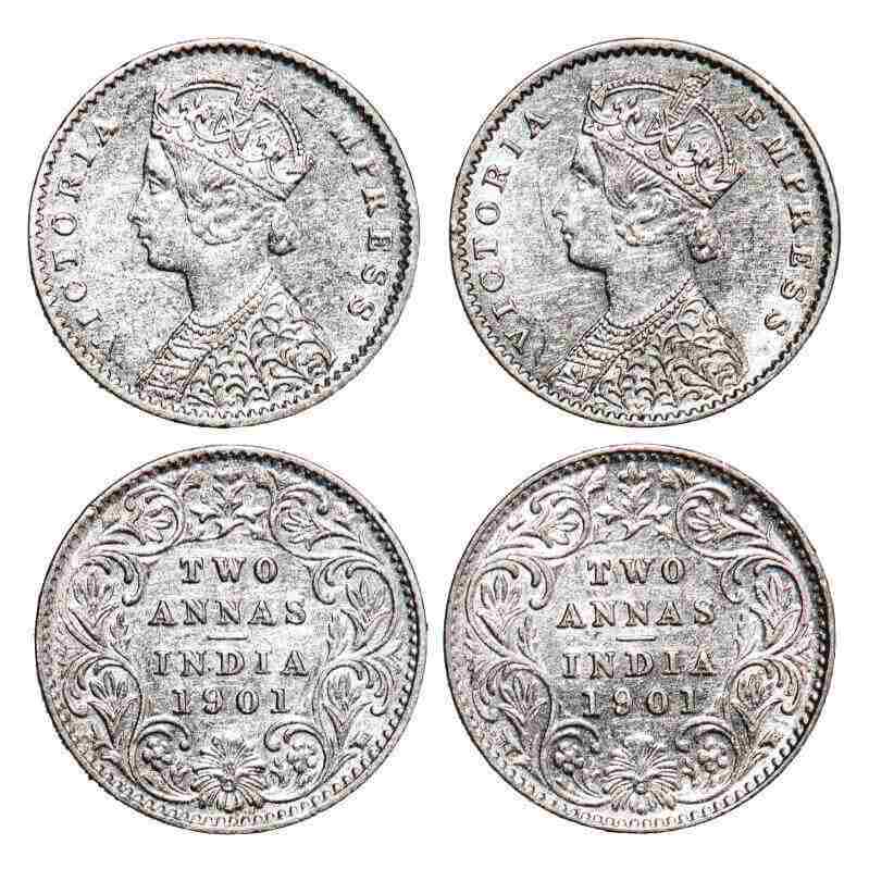 Victoria Empress, Silver, 2 Annas, (2 coins), 1901, Calcutta Mint, B/II, ‘C’ incused. F. Prid 515(2). GK 817(2). About Uncirculated to Uncirculated. Very Scarce.