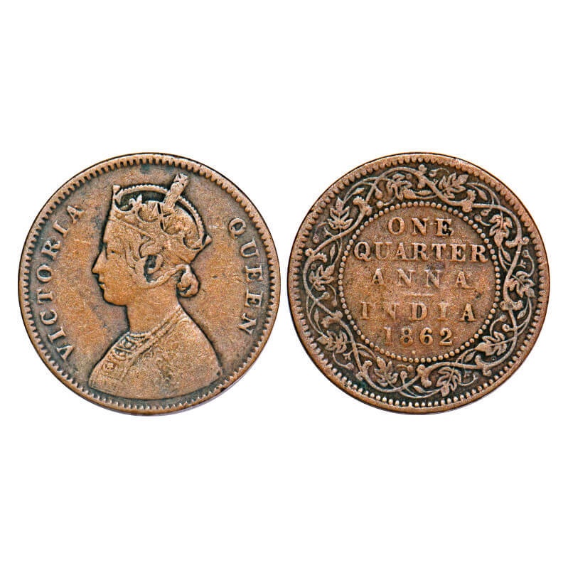 Victoria Queen, Copper, Quarter Anna, 1862, Bombay Mint, A/I, No mint mark, Tiny āVā incused. F. Pr...