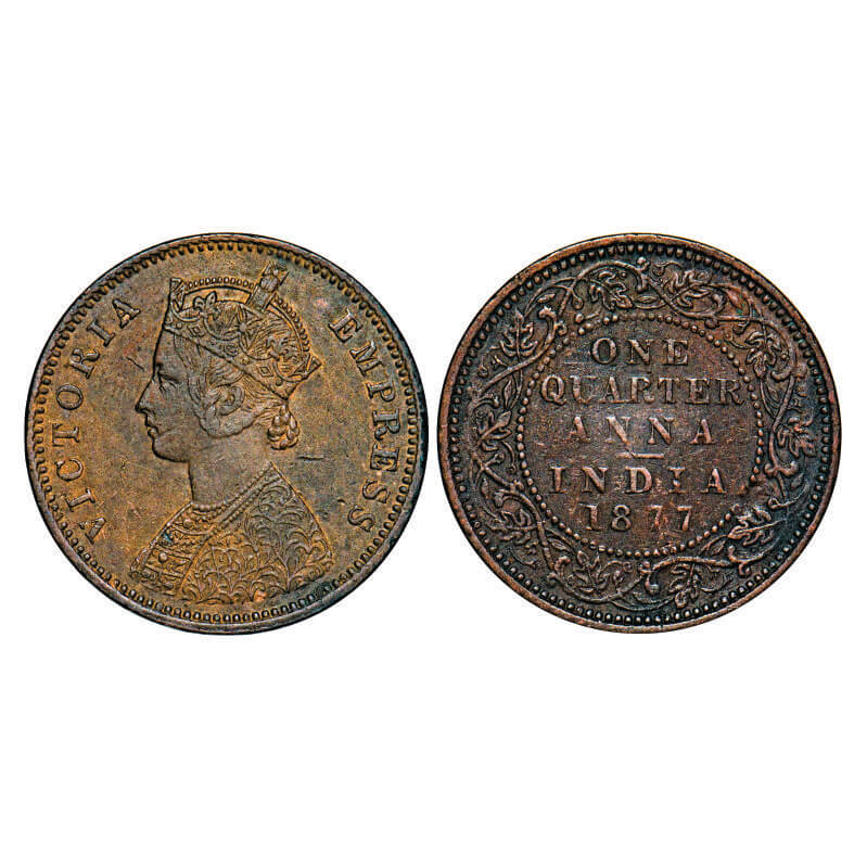 Victoria Empress, Copper, Quarter Anna, 1877, Bombay Mint, B/II, No mint mark. F. Prid 637. GK 828. Extremely Fine+. Very scarce.