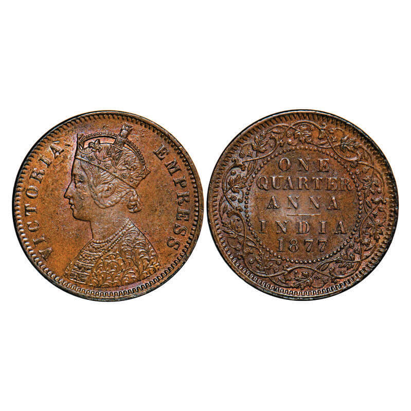 Victoria Empress, Copper, Quarter Anna, 1877, Calcutta Mint, B/II, No mint mark. F. Prid 611. GK 829. Almost Uncirculated. Rare.