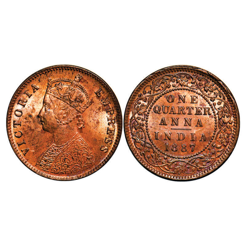 | Victoria Empress, Copper, Quarter Anna, 1887, Calcutta Mint, B/II, āCā incused, Ghost on Rev, Die crack on Obv, Multiple cud on Rev rim edge. F. Prid 620. GK 844. Uncirculated. Rare. |