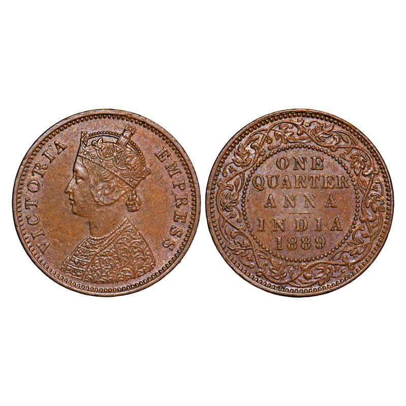 Victoria Empress, Copper, Quarter Anna, 1889, Bombay Mint, B/I, No mint mark. F. Prid 644. GK 847. Almost Uncirculated. Very Scarce.