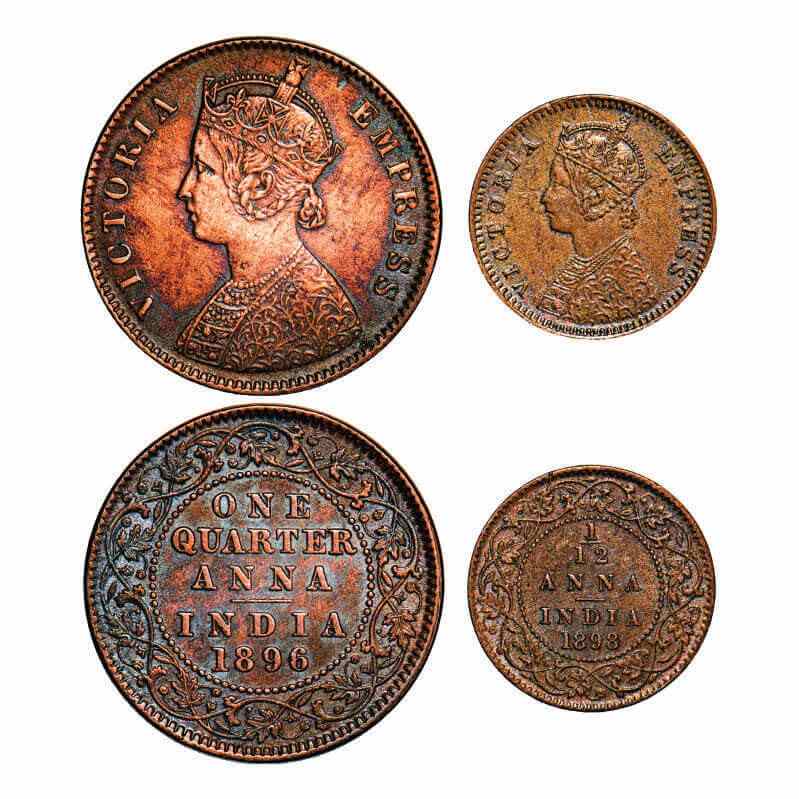 | Victoria Empress, Copper, (2 coins), 1) Quarter Anna, 1896, Calcutta Mint, B/II, No mint mark, 2) 1/12 Anna, 1898, Calcutta Mint, Obv B, No mint mark. F. Prid 629, 803. GK 855, 919. Extremely Fine to Extremely Fine+. Scarce. |
