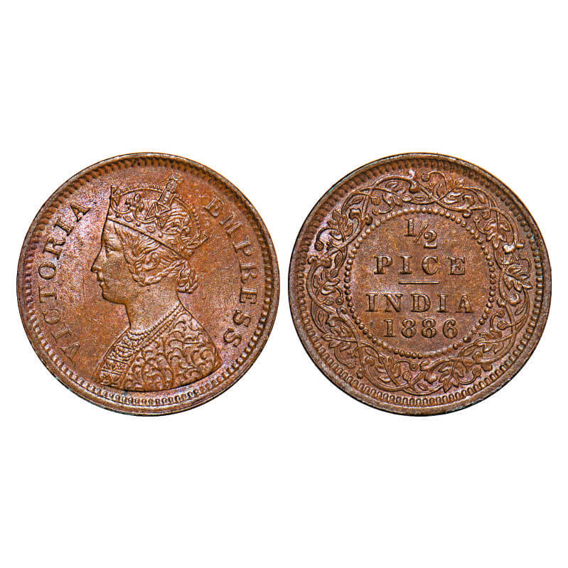 Victoria Empress, Copper, 1/2 Pice, 1886, Calcutta Mint, A/I, āCā incused. F. Prid 718. GK 864. Mint State. Rare.