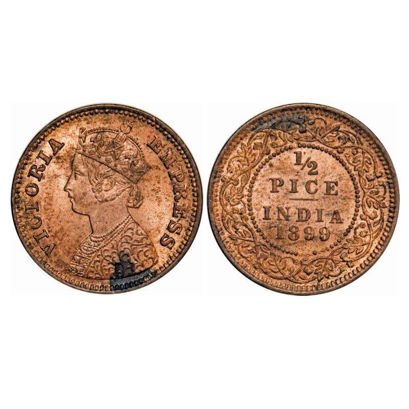 Victoria Empress, Copper, 1/2 Pice, 1899, Calcutta Mint, A/I, No mint mark. F. Prid 732. GK 879. Almost Uncirculated, Details. Very Scarce.