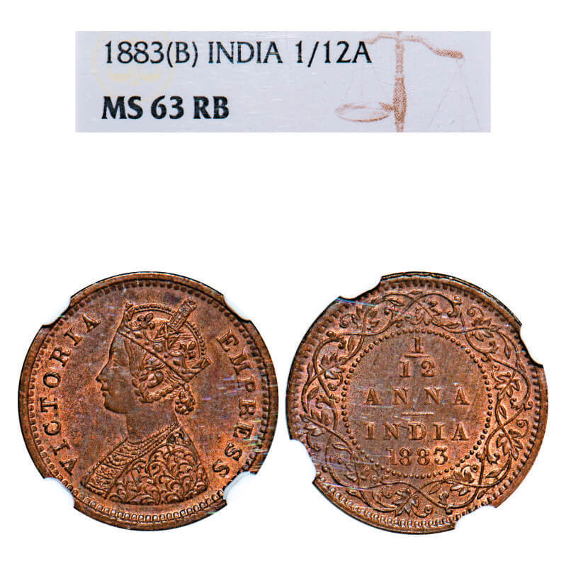 Victoria Empress, Copper, 1/12 Anna, 1883, Bombay Mint, Obv A, No mint mark. F. Prid 811. GK 895. NGC Slabbed MS 63 RB. Very Rare.