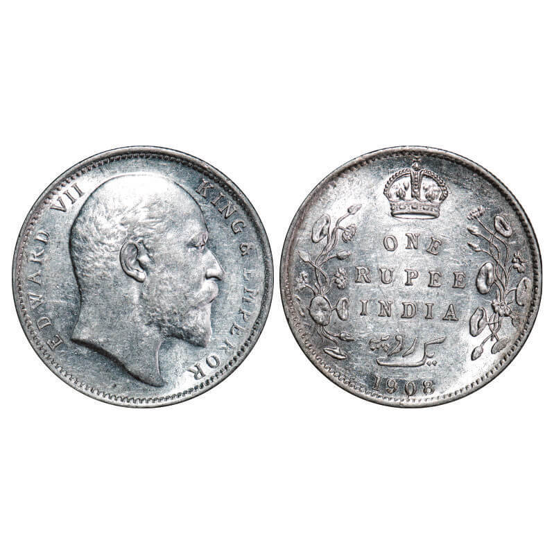 Edward VII, Silver, Rupee, 1908, Calcutta Mint, No mint mark, Ghost and die crack on Rev. F. Prid 194. GK 946. Uncirculated. Very Scarce.