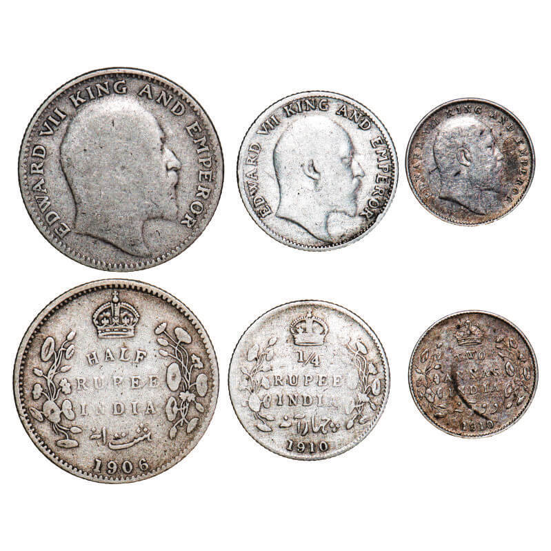 | Edward VII, Silver, (3 coins), 1) Half Rupee, 1906, Bombay Mint, ‘B’ incused no dot, 2) 1/4 Rupee, 1910, Bombay Mint, Dot, 3) 2 Annas, 1910, Bombay Mint, Dot. F. Prid 315, Unlisted, Unlisted. GK 963, 979, 988. Fine to Extremely Fine+. Scarce. |