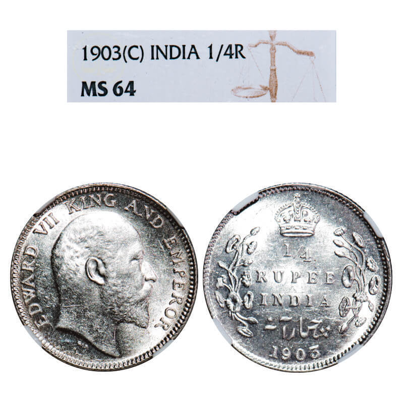 Edward VII, Silver, 1/4 Rupee, 1903, Calcutta Mint, No mint mark. F. Prid 432. GK 972. NGC Slabbed MS 64. Very Rare.