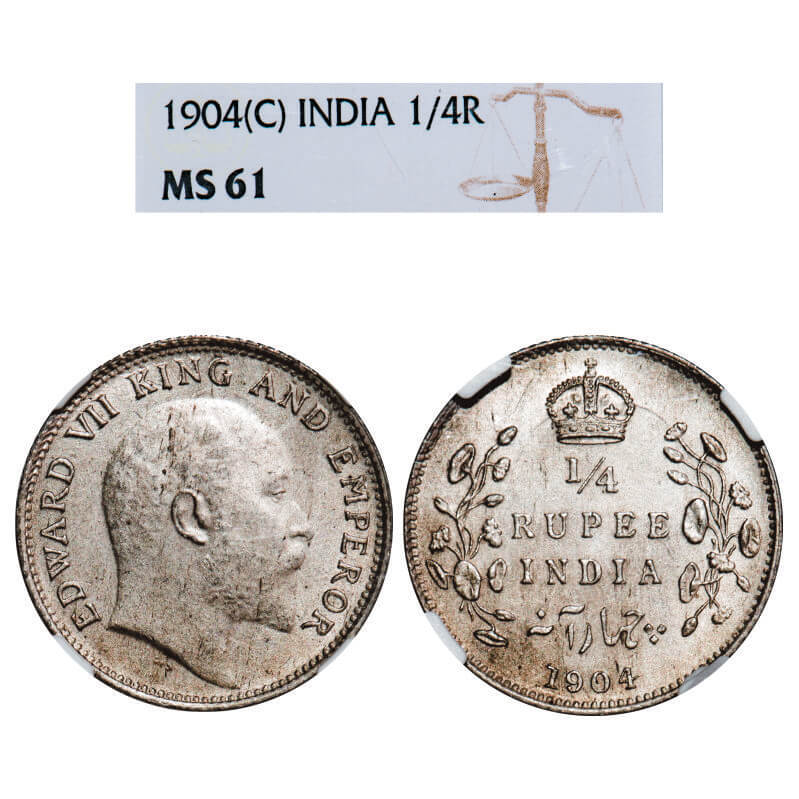 Edward VII, Silver, 1/4 Rupee, 1904, Calcutta Mint, No mint mark. F. Prid 433. GK 973. NGC Slabbed MS 61. Rare.