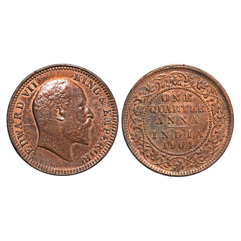 Edward VII, Copper, Quarter Anna, 1904, Calcutta Mint, No mint mark, Die crack on Obv and Rev. F. Prid 647. GK 995. About Uncirculated. Scarce.