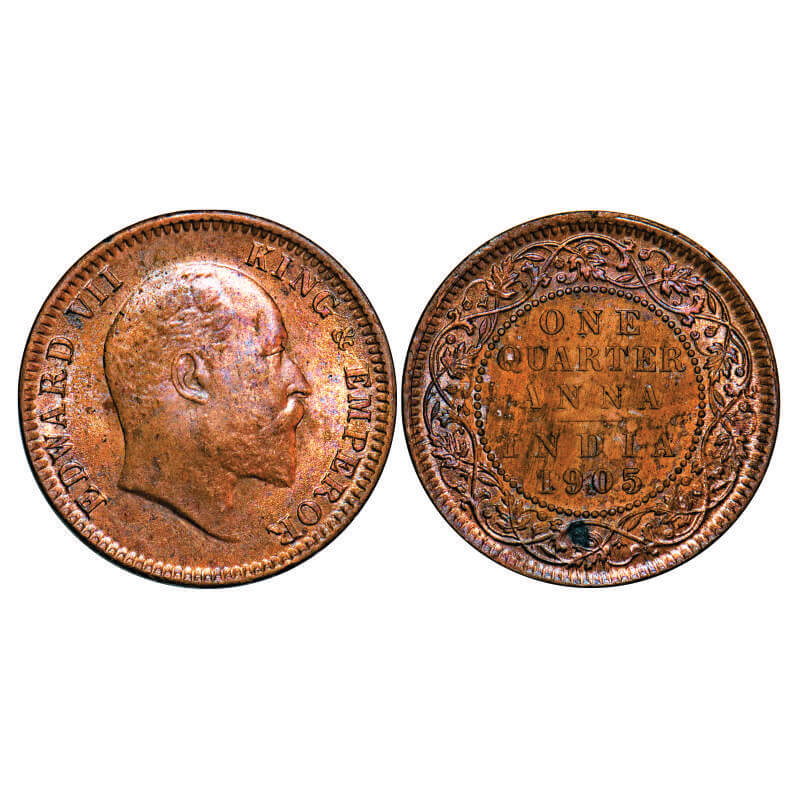 Edward VII, Copper, Quarter Anna, 1905, Calcutta Mint, No mint mark. F. Prid 649. GK 996. Brilliant Uncirculated. Very Scarce.
