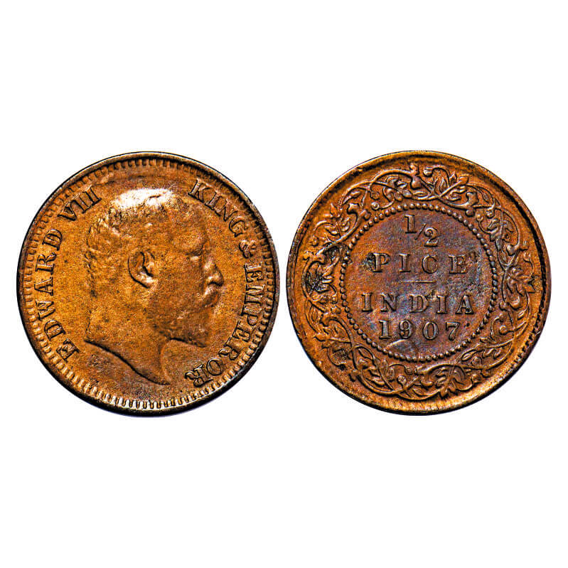 Edward VII, Bronze, 1/2 Pice, 1907, Calcutta Mint, No mint mark, Ghost on Rev. F. Prid 741. GK 1008. Extremely Fine. Scarce.