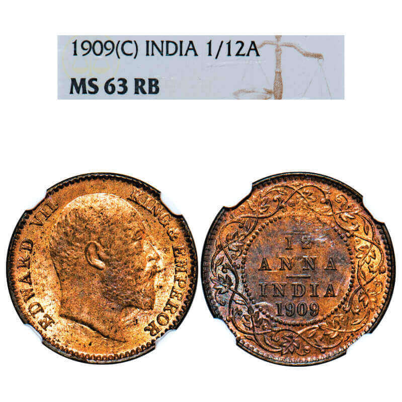 Edward VII, Bronze, 1/12 Anna, 1909, Calcutta Mint, No mint mark. F. Prid 825. GK 1019. NGC Slabbed MS 63 RB. Rare.