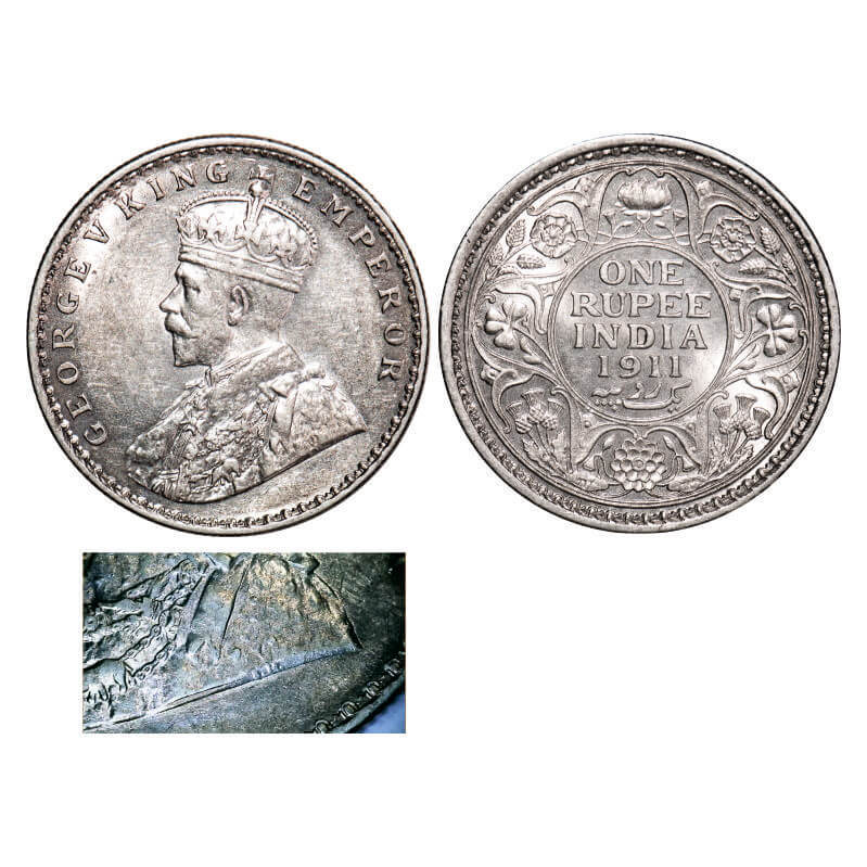 George V, Silver, Rupee, 1911, Calcutta Mint, No dot, Pig-Type, Raised initials ‘B M’ (Bertaram MacKennal) on the truncations of the Kings shoulder. F. Prid 207. GK 1021. Uncirculated. Rare.