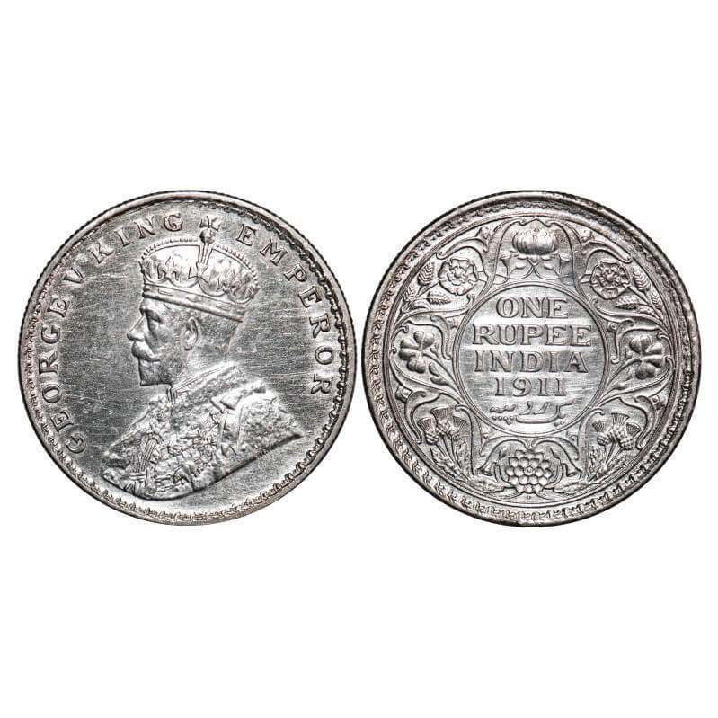| George V, Silver, Rupee, 1911, Bombay Mint, Dot, Pig-Type, die cracks on Obv, Raised initials ‘B M’ (Bertaram MacKennal) on the truncation of the Kings shoulder. F. Prid 217. GK 1022. Uncirculated. Rare. |