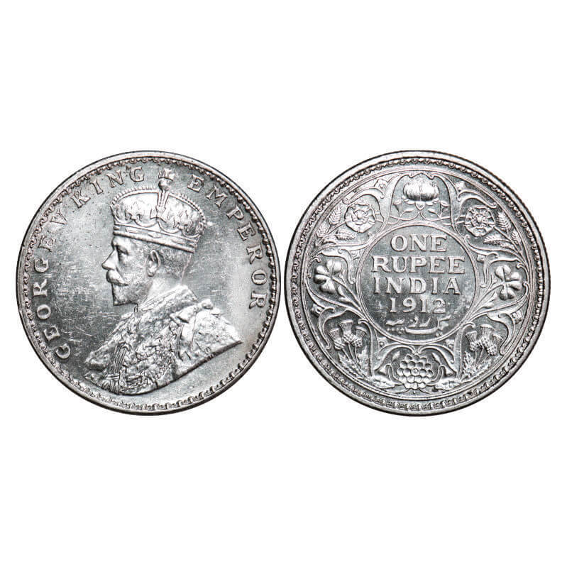 George V, Silver, Rupee, 1913, Calcutta Mint, No dot, Raised initials ‘B M’ (Bertram MacKennal) on ...