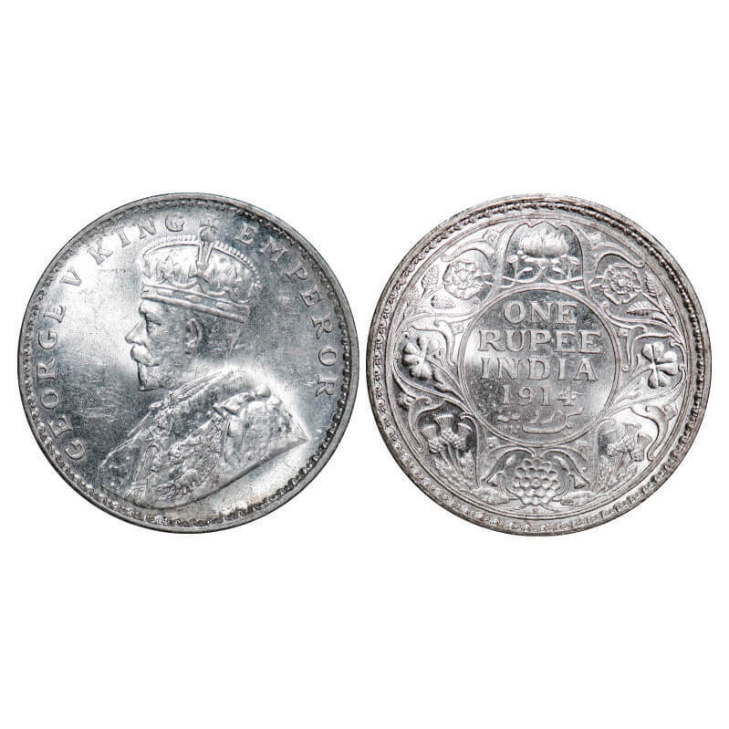 George V, Silver, Rupee, 1914, Bombay Mint, Dot, Raised initials ‘B M’ (Bertram MacKennal) on the t...