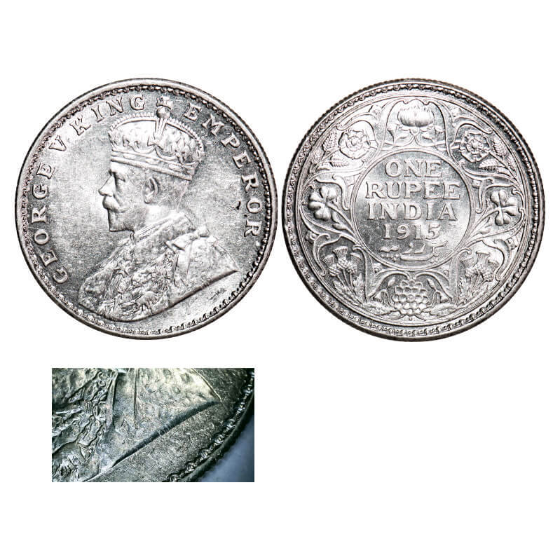 George V, Silver, Rupee, 1915, Bombay Mint, Dot, Raised initials ‘B M’ (Bertaram MacKennal) on the truncation of the Kings shoulder. F. Prid 221. GK 1032. Mint State. Rare.