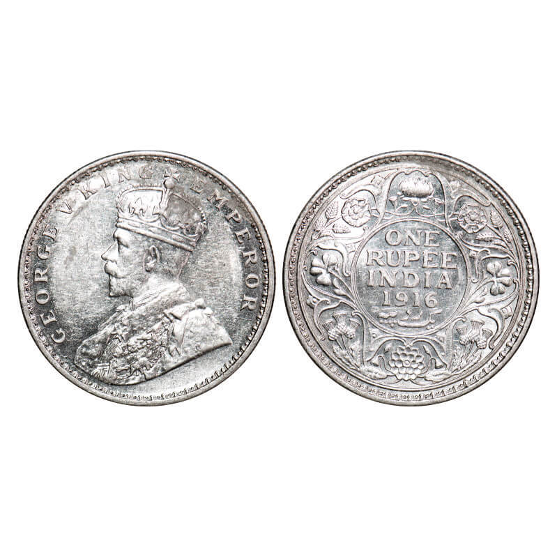 George V, Silver, Rupee, 1916, Calcutta Mint, No dot, Raised initials ‘B M’ (Bertaram MaCkennal) on...