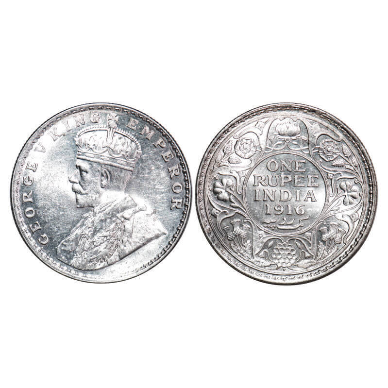 | George V, Silver, Rupee, 1916, Bombay Mint, Dot, Ghost on Rev, Raised initials ‘B M’ (Bertaram MacKennal) on the truncation of the Kings shoulder, Ghost on Rev. F. Prid 222. GK 1034. Brilliant Uncirculated. Very Scarce. |