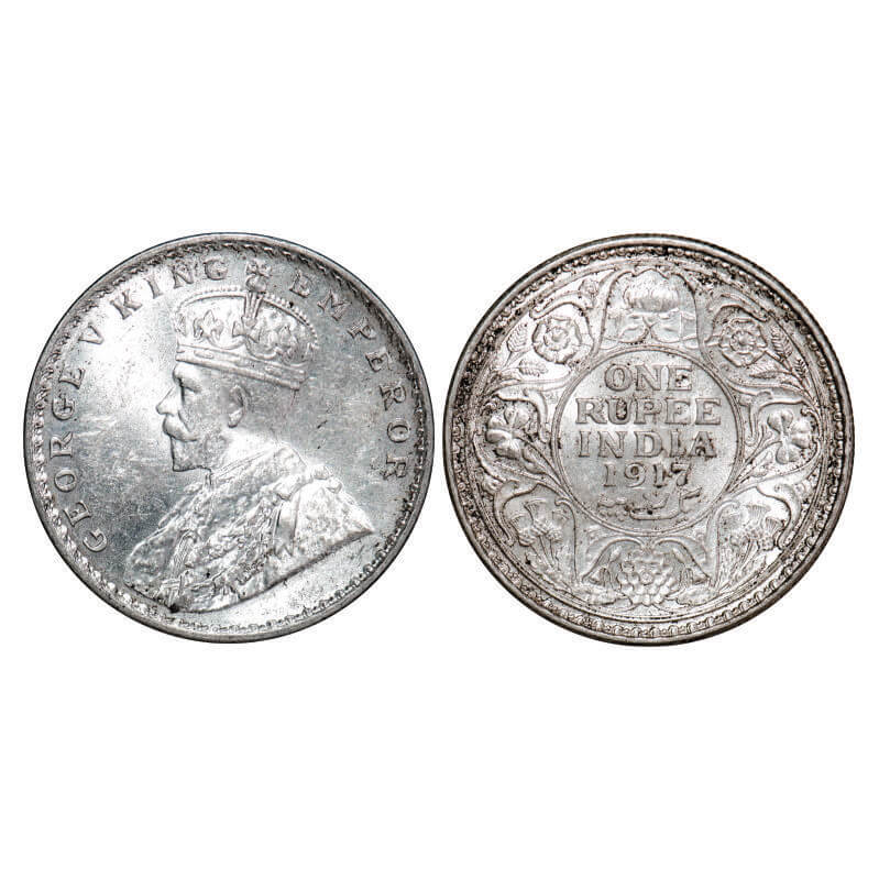 George V, Silver, Rupee, 1917, Bombay Mint, Dot, Raised initials ‘B M’ (Bertram MacKennal) on the t...