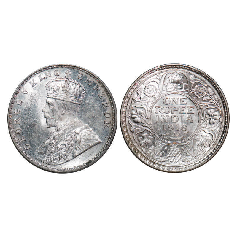 George V, Silver, Rupee, 1918, Calcutta Mint, No dot. F. Prid 214. GK 1037. Mint State. Very Scarce.