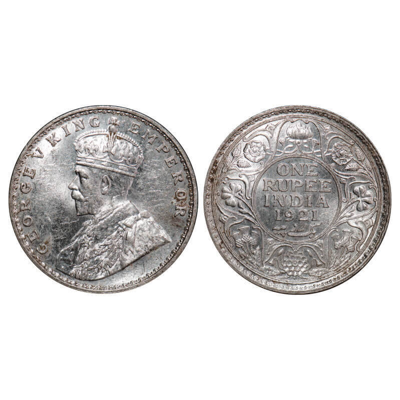 George V, Silver, Rupee, 1921, Bombay Mint, Dot, Raised initials ‘B M’ (Bertram MacKennal) on the truncations of Kings shoulder. F. Prid 227. GK 1043. Mint State. Rare.