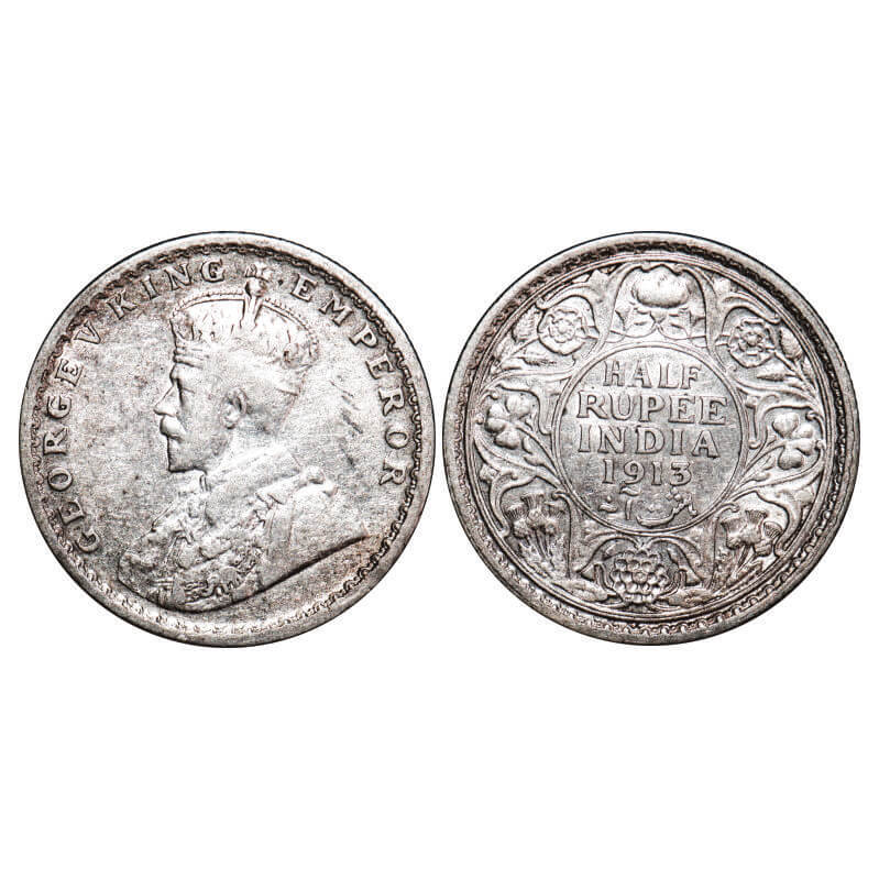 George V, Silver, Half Rupee, 1913, Calcutta Mint, No dot. F. Prid 320. GK 1048. About Extremely Fine. Scarce.