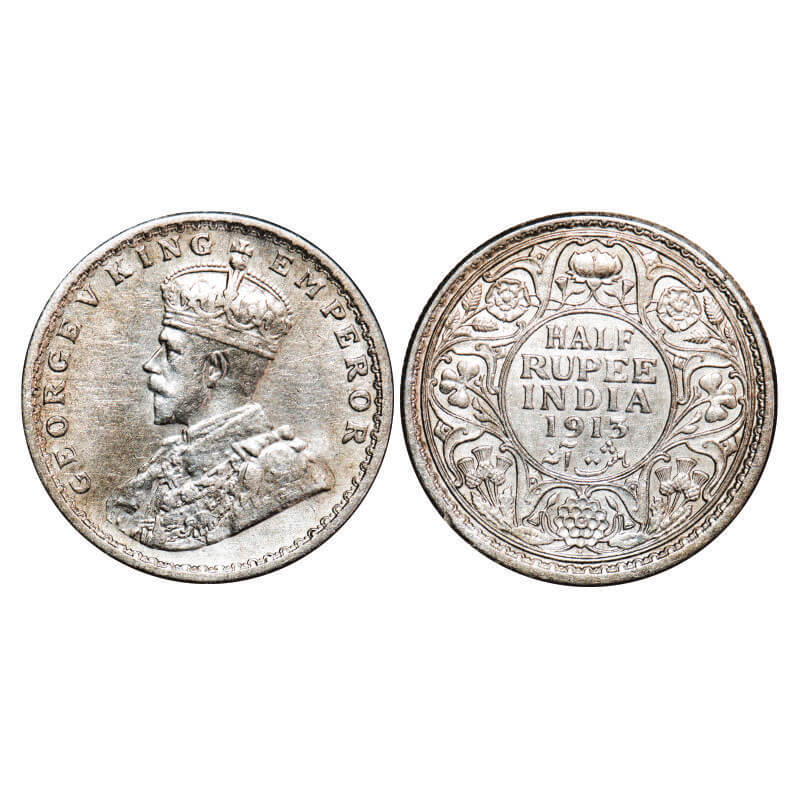 George V, Silver, Half Rupee, 1913, Calcutta Mint, No dot. F. Prid 320. GK 1048. About Extremely Fi...