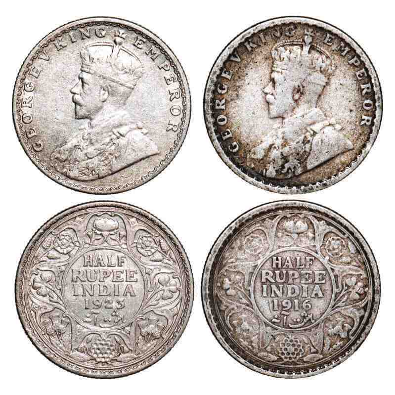 | George V, Silver, Half Rupee, (2 coins), 1916, 1923, Bombay Mint, dot. F. Prid 340, 345. GK 1054, 1062. Very Fine to Very Fine+. Scarce. |