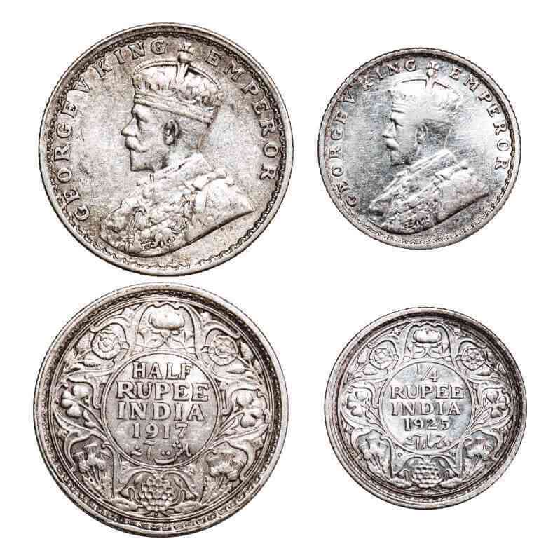 | George V, Silver, (2 coins), 1) Half Rupee, 1917, Bombay Mint, Dot, 2) 1/4 Rupee, 1925, Bombay Mint, Dot. F. Prid 341, 458. GK 1055, 1093. Very Fine to Very Fine+. Scarce. |