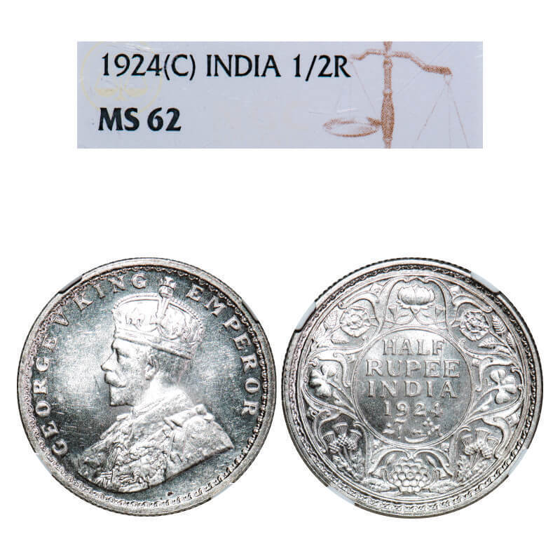 George V, Silver, Half Rupee, 1924, Calcutta Mint, No dot. F. Prid 327. GK 1063. NGC Slabbed MS 62. Rare.