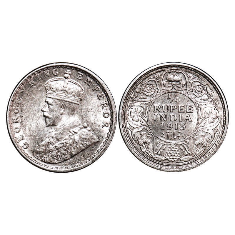 George V, Silver, 1/4 Rupee, 1913, Calcutta Mint, No dot. F. Prid 442. GK 1083. Uncirculated. Very Scarce.