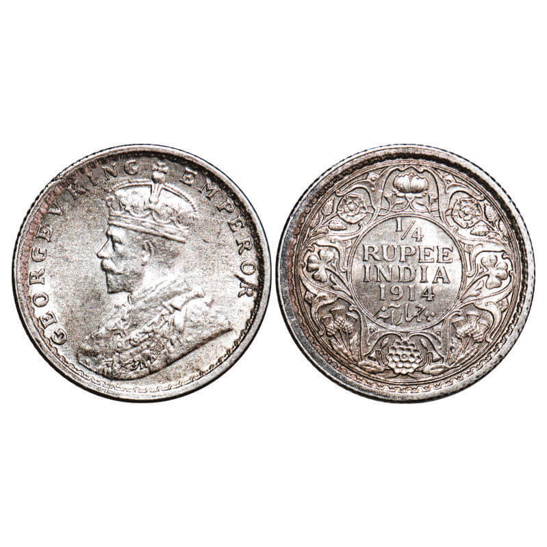 George V, Silver, 1/4 Rupee, 1914, Calcutta Mint, No dot. F. Prid 443. GK 1085. Almost Uncirculated. Very Scarce.