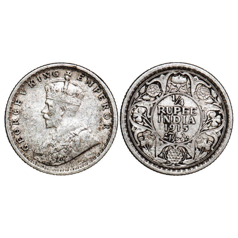 George V, Silver, 1/4 Rupee, 1915, Calcutta Mint, No dot. F. Prid 444. GK 1087. Very Fine+. Very Scarce.