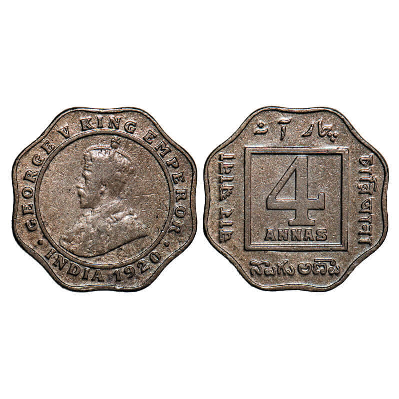 George V, Copper-Nickel, 4 annas, 1920, Calcutta Mint, No dot. F. Prid 875. GK 1103. About Extremel...