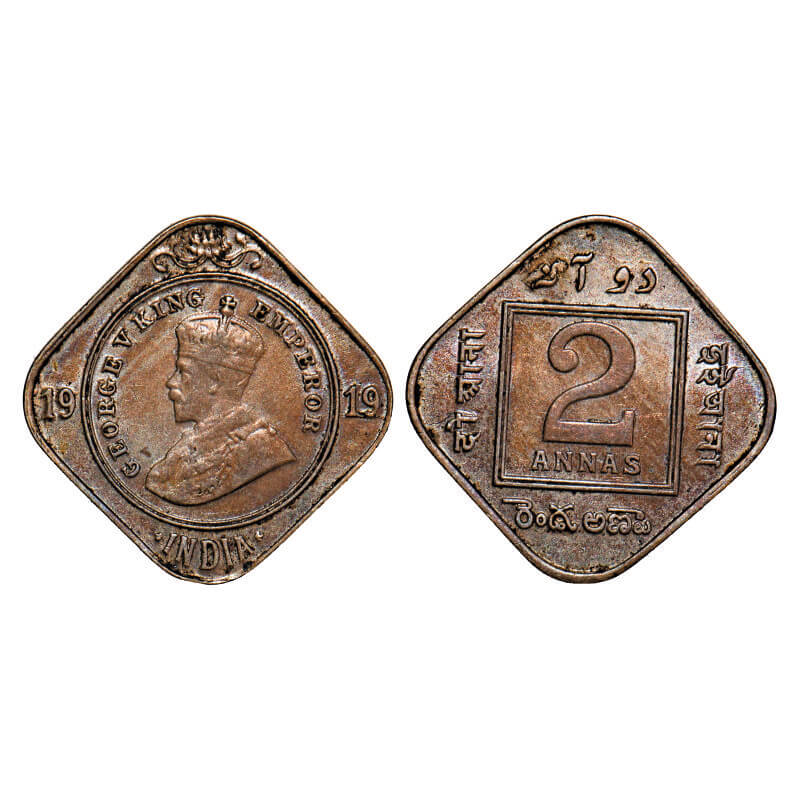 George V, Copper-Nickle, 2 Annas, 1919, Calcutta Mint, No dot, Planchate flaw on Obv. F. Prid 881. GK 1120. Extremely Fine. Scarce.
