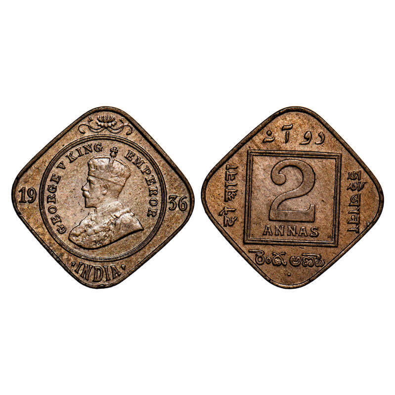 George V, Copper-Nickel, 2 annas, 1936, Bombay Mint, Dot. F. Prid 903. GK 1140. About Uncirculated, Toned. Scarce.
