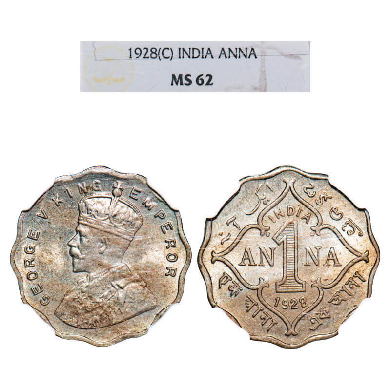 George V, Copper-Nickel, 1 Anna, 1928, Calcutta Mint, No dot. F. Prid 934. GK 1161. NGC Slabbed MS 62. Rare.