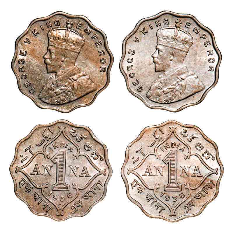 | George V, Copper-Nickel, 1 Anna, (2 coins), 1936, Bombay Mint, Dot, 1) Small dot, 2) Big dot. F. Prid 958, 958. GK 1168, 1169. Almost Uncirculated to Uncirculated. Scarce. |