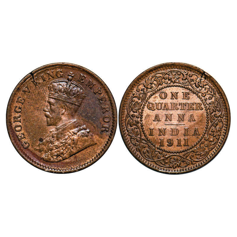 George V, Bronze, Quarter Anna, 1911, Calcutta Mint, No dot, Pig-Type, Planchate crack on the rim edge. F. Prid 656. GK 1171. Extremely Fine+. Scarce.