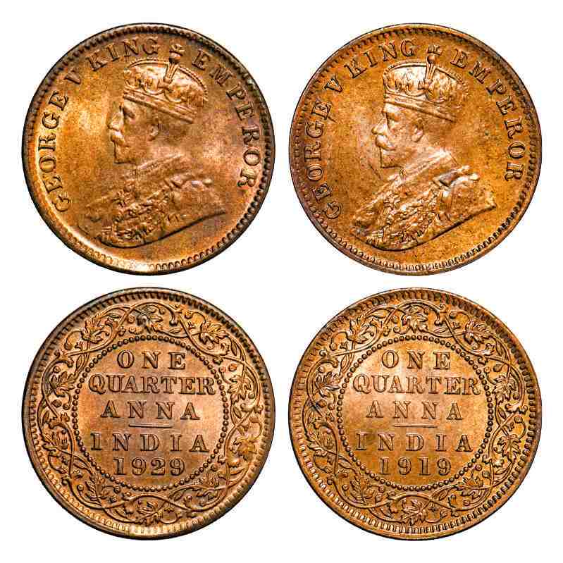 George V, Bronze, Quarter Anna, (2 coins) 1919, 1929, Calcutta Mint, No dot. F. Prid 664, 670. GK 1178, 1189. Uncirculated. Scarce.