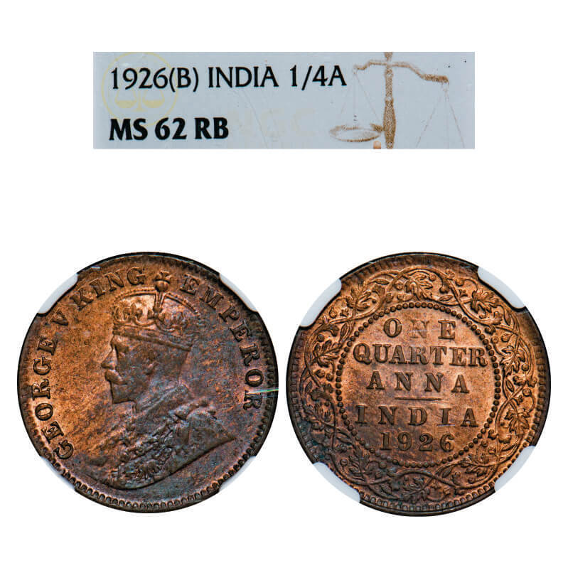 George V, Bronze, Quarter Anna, 1926, Bombay Mint, Dot. F. Prid 679. GK 1183. NGC Slabbed MS 62 RB. Rare.