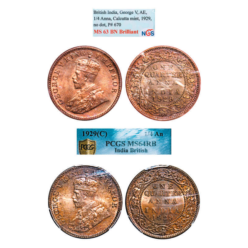 George V, Bronze, Quarter Anna, (2 slabs), 1929, Calcutta Mint, No dot. F. Prid 670(2). GK 1189(2). PCGS Slabbed MS 64 RB. NGS Slabbed MS 63 BN Brilliant. Very Scarce.