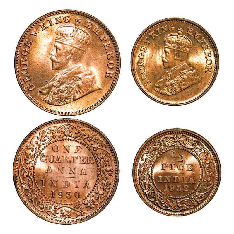 | George V, Bronze, (2 coins), 1) Quarter Anna, 1930, Bombay Mint, Dot, Year date numerals has more space in between 1930 and smaller in size, 2) 1/2 Pice, 1932, Calcutta Mint, No mint mark. F. Prid Unlisted, 765. GK Unlisted, 1218. Brilliant Uncirculated. Very Scarce. |