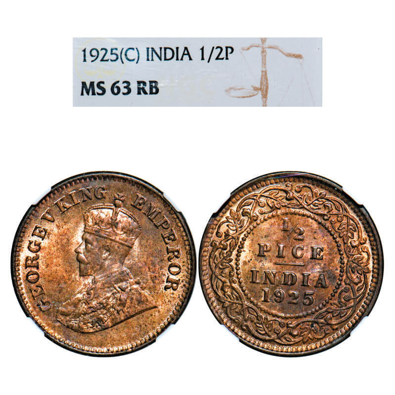 George V, Bronze, 1/2 Pice, 1925, Calcutta Mint, No mint mark. F. Prid 758. GK 1211. NGC Slabbed MS 63 RB. Scarce.